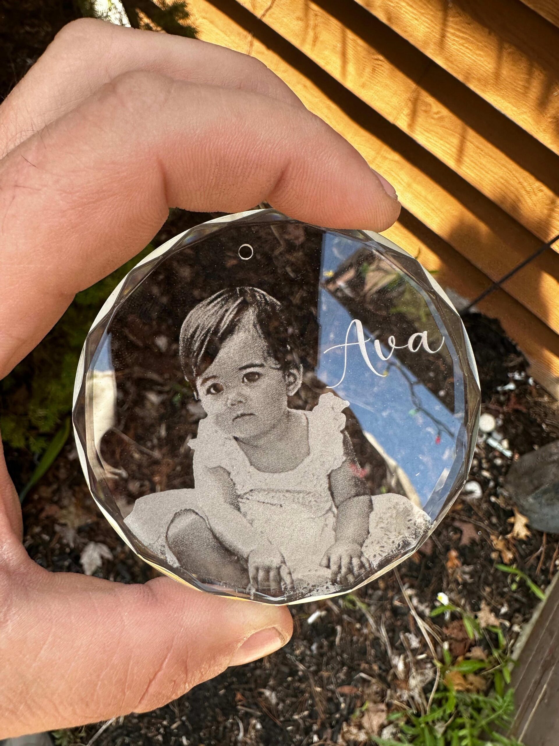 Its all about laser innovation. Custom etch family photos into this sparkly crystal. We have customized our crystals to be the most precious photo laser etched option on the market, exclusively offered to our prestigious customers. Most competitors offer circle ornaments that are just 1/8″ thin, brittle and have a diameter of 1.5″. Our crystals are 3/8″ thick, robust, have a diameter of 3″ (double others) and rich with facets along the entire circumference.